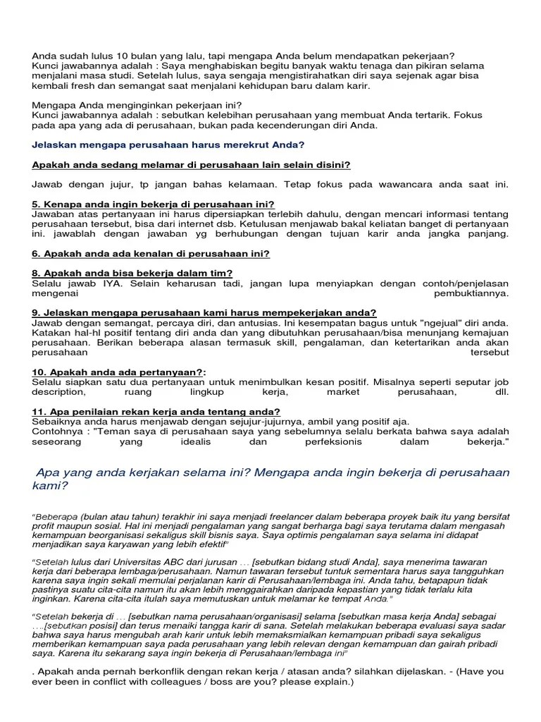 Magang atau percobaan atau pelatihan. Berikut 9 tips agar interview . Apakah anda memiliki pengalaman kerja sebelumnya? Mengapa anda ingin bekerja di perusahaan kami? adalah pertanyaan umum dalam interview kerja. Kenali cara menjawab dan kesalahan umumnya di .